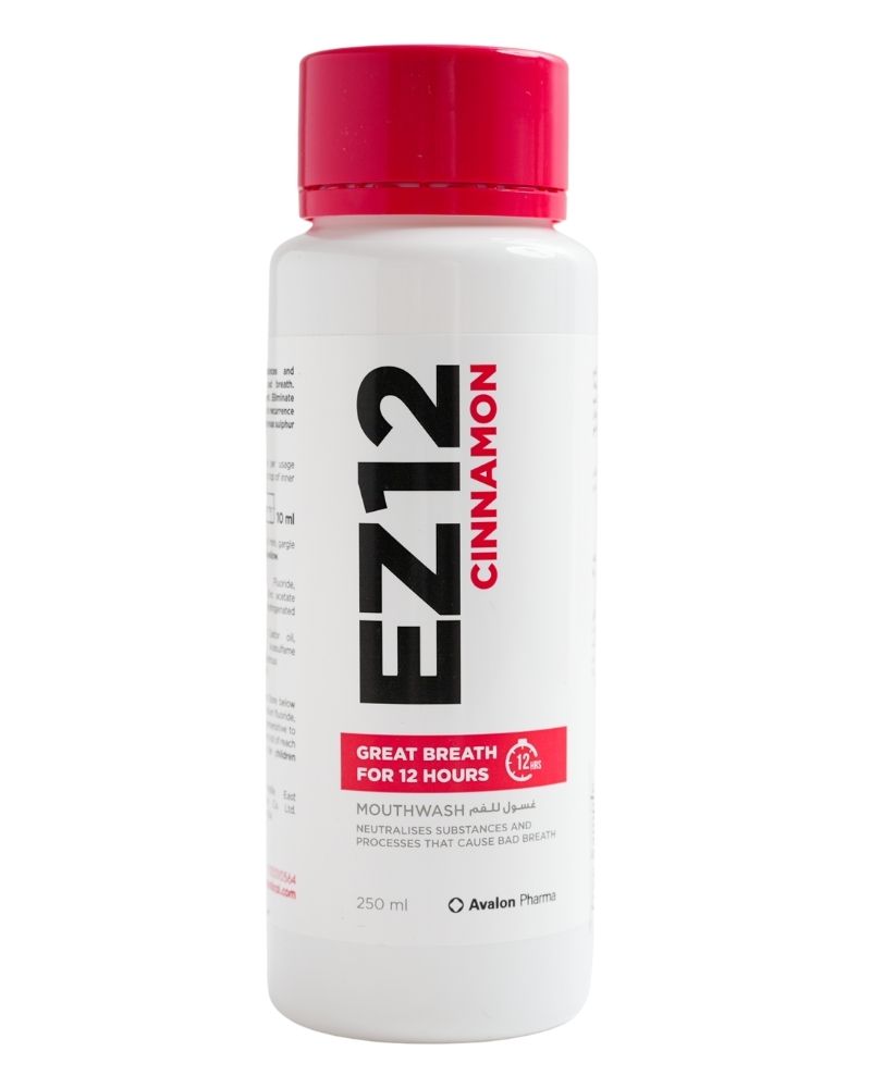 EZ12 Cinnamon Mouthwash is a high-performance daily oral rinse that provides up to 12 hours of fresh breath. Formulated with Sodium Fluoride, Chlorhexidine Diacetate, and Zinc Acetate, it neutralizes bad breath at its source, supports gum health, and strengthens teeth. The warming cinnamon flavor, blended with menthol, offers a refreshing and pleasant taste. Ideal for adults and teens aged 12 and up, it delivers a deep clean and promotes long-term oral hygiene when used consistently.