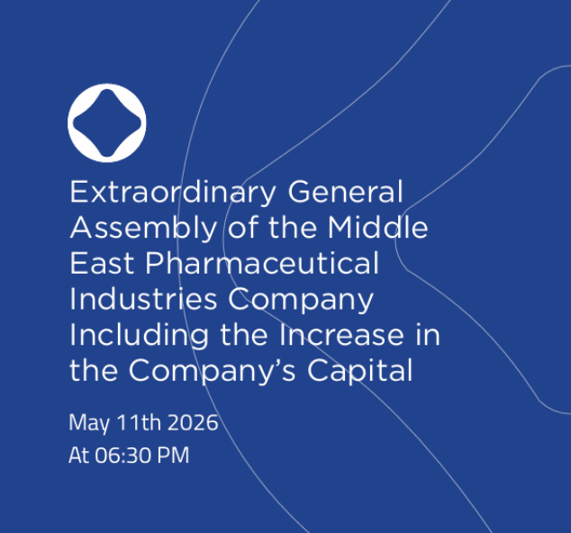 يسر مجلس إدارة شركة الشرق الأوسط للصناعات الدوائية أن يدعو السادة المساهمين للمشاركة والتصويت في اجتماع الجمعية العامة غير العادية (الاجتماع الأول) والمقرر انعقادها بمشيئة الله تعالى في تمام الساعة (18:30) يوم الأثنين 24-11-1447هـ الموافق 11-05-2026م عن طريق وسائل التقنية الحديثة باستخدام منظومة تداولاتي.