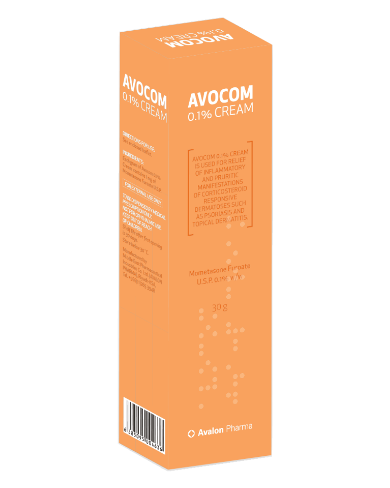 Avocom Cream contains mometasone furoate, a potent topical corticosteroid effective in managing inflammatory skin conditions such as psoriasis and dermatitis. It helps reduce redness, itching, and swelling associated with these conditions. Psoriasis causes itchy, scaly patches commonly on elbows, knees, and scalp. Dermatitis arises from irritation due to agents like detergents. Applied once daily in a thin layer, Avocom is not recommended for prolonged use, especially on face or in children, and should be used under medical guidance to avoid side effects like skin thinning, hormone imbalance, or infections.