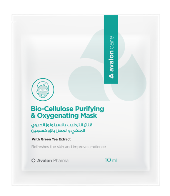 avaloncare Bio-cellulose Purifying & Oxygenating Mask provides a second skin eect that perfectly fits the face shape. The refreshing serum provides detox benefits and gently removes impurities of the skin. The skin regains its radiance and freshness. Oxygeskin® improves the radiance and the condition of skin surface by promoting the oxygenation of skin cells. The skin regains all its beauty. Fucogel® forms a film on the skin surface to maintain its hydration in addition to its stimulating and toning eect. Green Tea Extract which is rich in vitamins and minerals provide antioxidant and purifying virtues enabling a detox action. Purisoft® completes the cleansing of the skin by removing micro-particles from pollution while protecting it against external aggressions.
