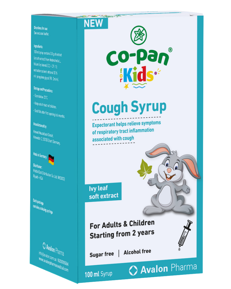A: Co-Pan Cough Syrup contains ivy leaf extract, which helps loosen mucus in the airways and soothes irritation, making coughs easier to manage and reducing discomfort.